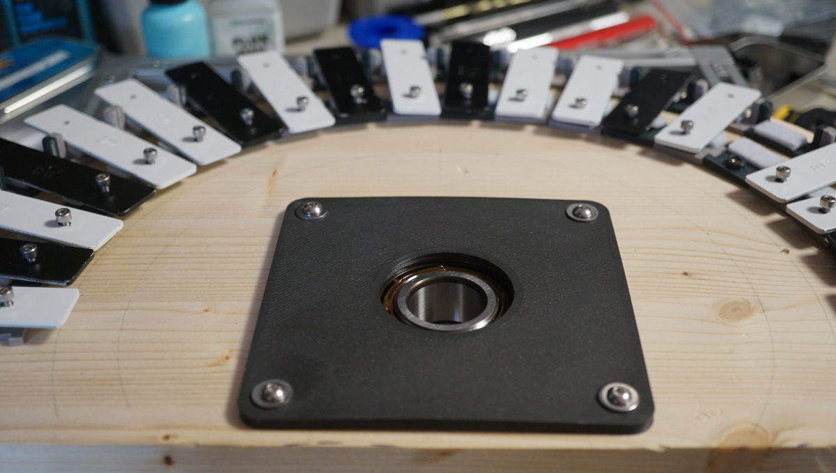 Platformas turēšanai stāv skaists 3205 radiālaksiālais gultnis, kurš šim projektam un tā vieglajai platformai, visdrīzāk, ir overkills, bet jūtas ārkārtīgi patīkami. Tas ir iespiests starp divām no ASA drukātām plāksnēm.