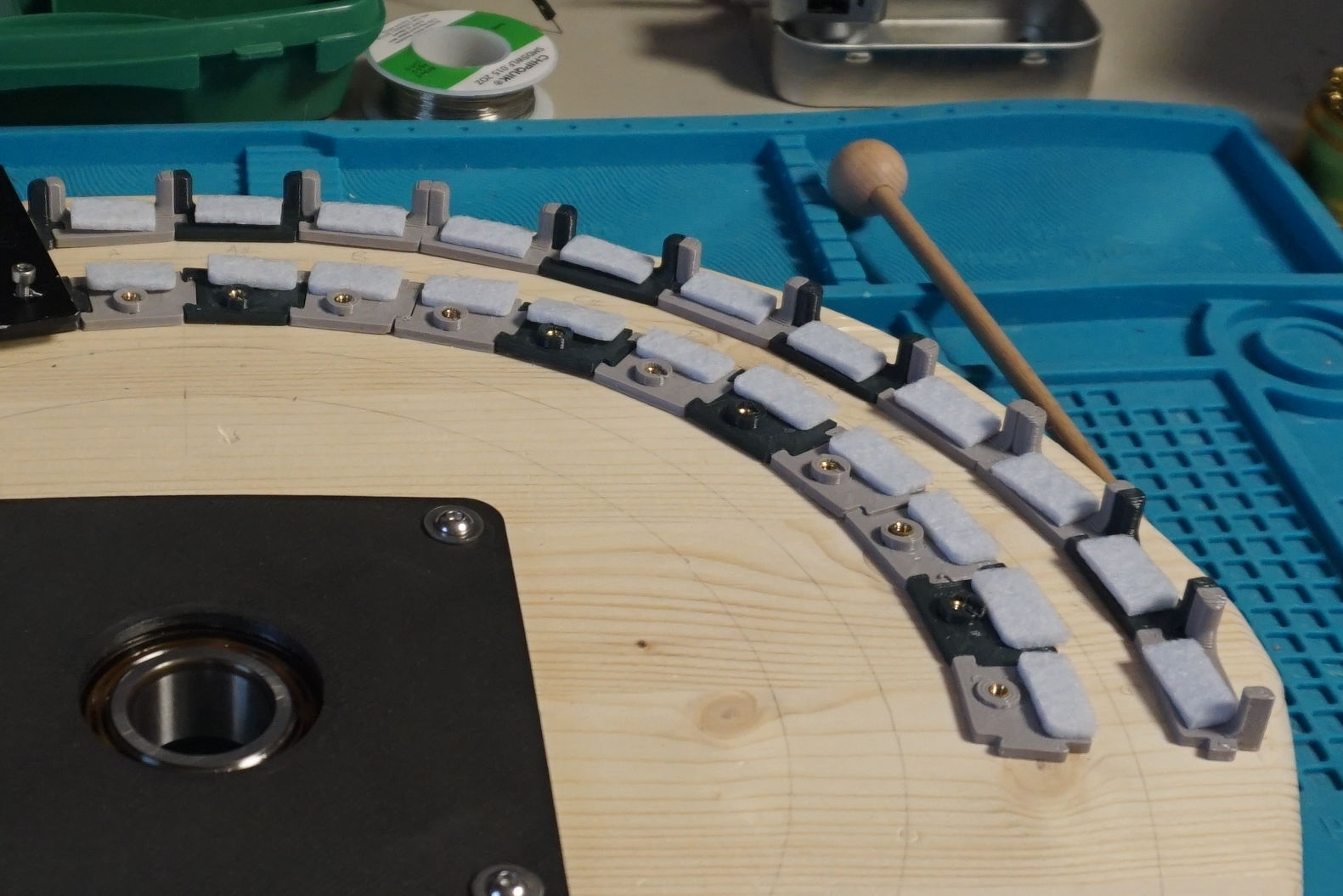 Mēlīšu skanēšana bija netriviāls jautājums — oriģinālajam ksilofonam mēlītes pieturēja biezas gumijas “nagliņas”, kuras aizvietot man neizdevās. Pēc vairākiem mēģinājumiem, paliku pie tā, ka maaaaazdrusciņ ar dremeli pafrēzēju mēlīšu caurumus lielākus, lai M3 skrūvīte tiem ietu cauri brīvi, tos pieturot, un pašas mēlītes guļ uz uzlīmētiem voiloka gabaliņiem. Skan, bet jāsit diezgan maigi: šķiet, ka vajadzēt modulēt solenoīdus, lai nesit kā ar stipru āmuru.