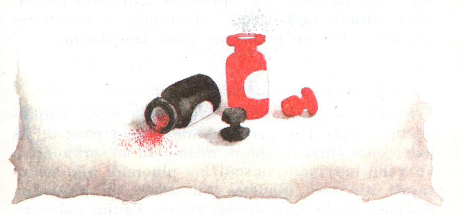 Kamēr Zitto un Bosso no 8 km augstuma vēroja Mākslīgās Saules būvlaukumu, mazā Džī bija palikusi tēta laboratorija viena, jo tēti pa telefonu steidzīgi izsauca institūta direktors. Mazā Džī piegāja pie spoguļa, kas atradās virs izlietnes, pavērās savā attēlā, parādīja tam mēli, savaikstīja skābekļa maskā iemaukto ģīmīti, cik vien muļķīgi mācēja, tad apsviedās uz viena no papēžiem par 180° un pēkšņi ieraudzīja skapīti, kuru šodien vēl nebija pārbaudījusi. Atvērusi skapīša durtiņas, viņa tūlīt ievēroja uz plaukta virkni sarkanu un melnu burciņu. «Ai!» nopriecājās mazā Džī. «Nu gan paspēlēšos!»